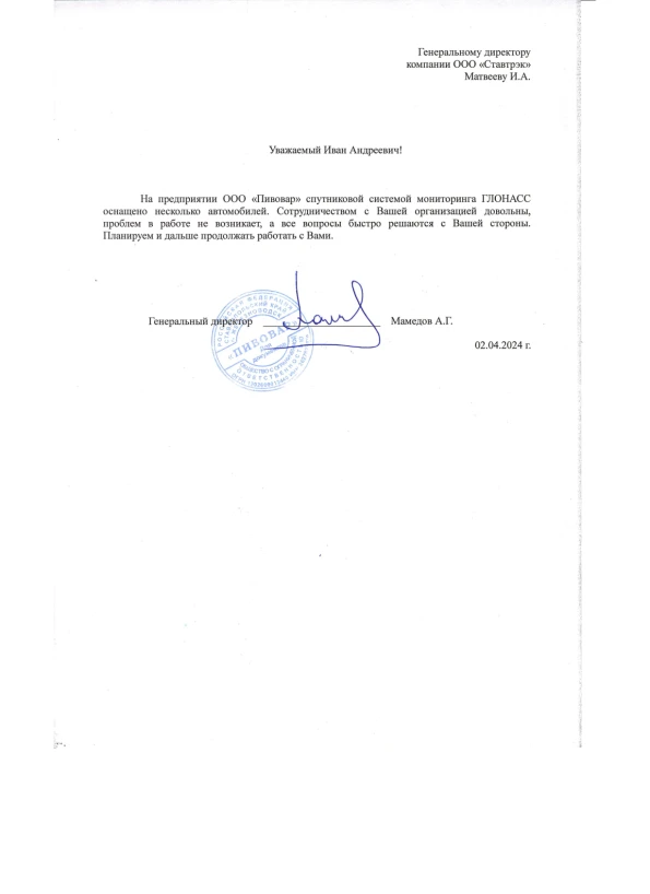 Пользуемся услугами компании Ставтрэк уже давно и очень довольны! Система мониторинга транспорта, контроль топлива и тахографы работают без сбоев, помогают нам разумно экономить и эффективно управлять автопарком. Всегда оперативная поддержка и дружелюбный персонал. Рекомендуем!