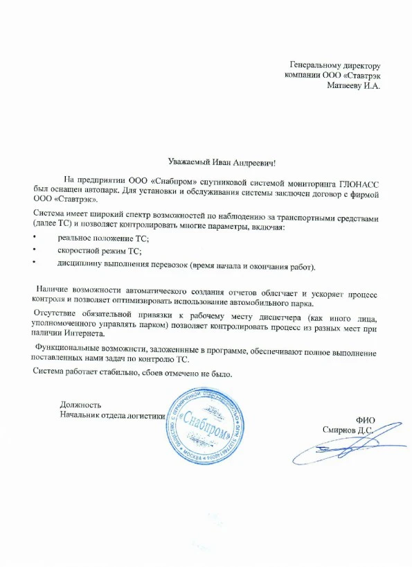 Выражаем благодарность компании ООО «Ставтрэк» за качественный и профессиональный подход в оснащении нашего автотранспорта системой ГЛОНАСС/GPS мониторинга топлива. Особенно ценим оперативную поддержку и подробную консультацию специалистов компании по всем возникающим вопросам. Рекомендуем к сотрудничеству!
