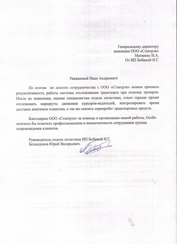 Наше предприятие недавно внедрило систему отслеживания транспорта от компании «Ставтрэк», и мы очень довольны выбором. За короткое время сотрудники оценили удобство и простоту отслеживания перемещения курьеров и управления транспортом. Теперь гораздо легче контролировать сроки доставки покупателям и оптимизировать процессы. Отдельное спасибо за высокий профессионализм и отзывчивость сотрудников компании «Ставтрэк», которые всегда готовы помочь при возникновении любых задач и вопросов.