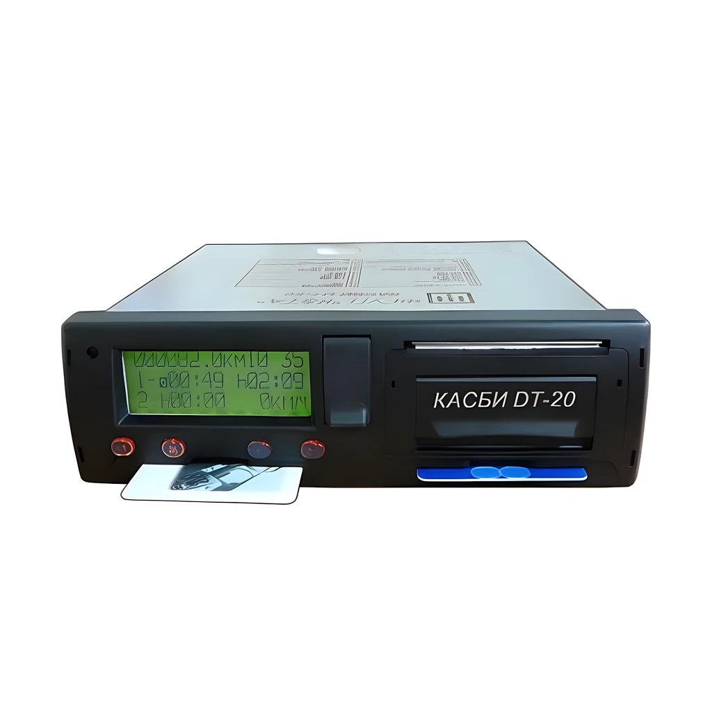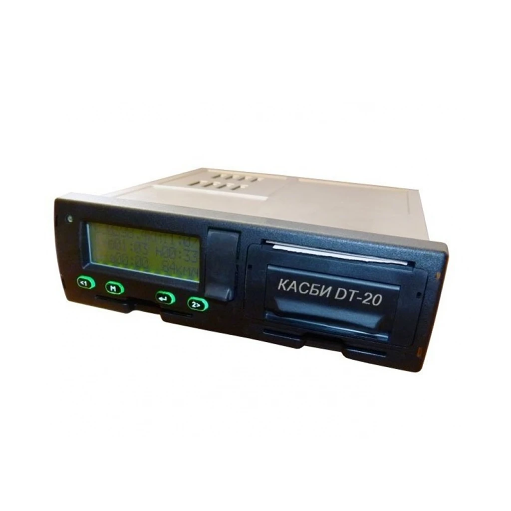 Цифровой тахограф «КАСБИ –DT-20» Содержит трехстрочный дисплей с возможностью отображения, наряду с принятыми в обращение пиктограммами, русифицированной информации. Кроме того для программирования (ввода параметров калибровки, параметров транспортного средства и т.п. ) существует сервисное ПО. При помощи кабеля USB-AA тахограф подключается к PC для выгрузки данных из контрольного устройства или с карты Водителя.