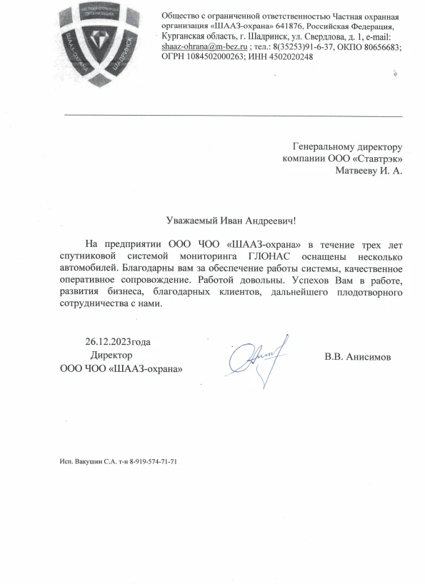 Сертификат соответствия 627.48 кб СКАЧАТЬ Руководство пользователя 943.86 кб СКАЧАТЬ На протяжении трех лет используем систему спутникового мониторинга ГЛОНАСС от компании «Ставтрэк» в нашем автотранспорте. Хотим отметить высокое качество оборудования и своевременную помощь специалистов. Очень довольны сотрудничеством! Желаем компании дальнейших успехов, развития и побольше довольных клиентов!