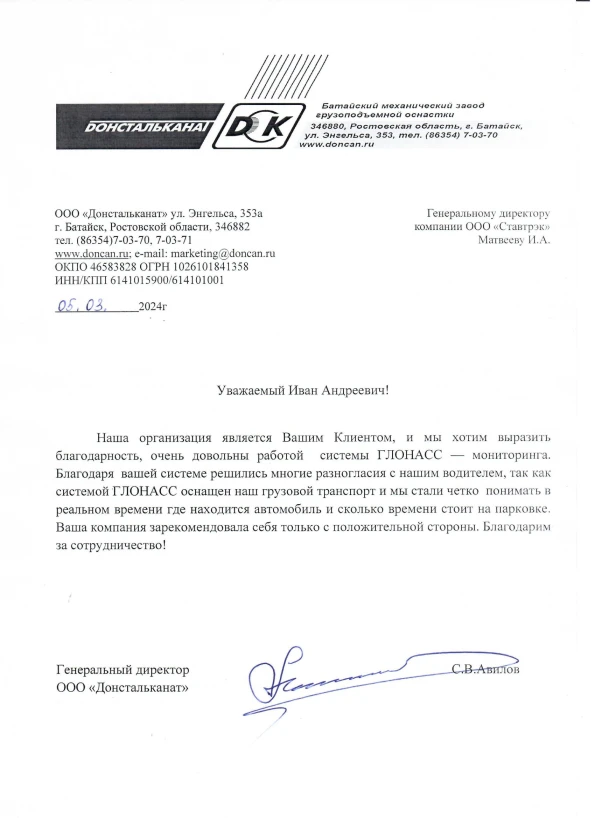От имени компании хотим выразить огромную благодарность за эффективную работу системы ГЛОНАСС, приобретённой у компании «Ставтрэк». Теперь мы можем оперативно получать точную информацию об автомобиле и времени его простоя, а вопрос дисциплины водителей решился сам собой. Считаем, что это отличный продукт, и компания зарекомендовала себя с наилучшей стороны. Большое спасибо!