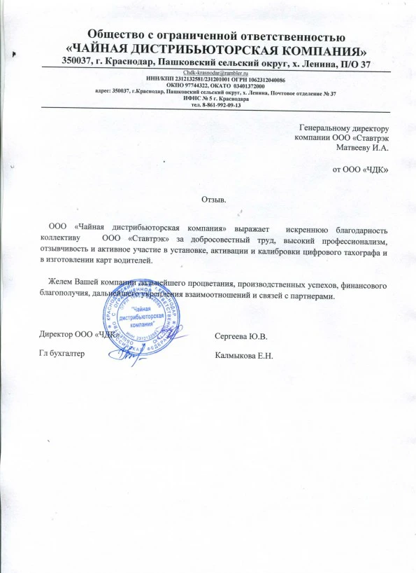 Хотим выразить огромную благодарность команде Ставтрэк за профессионализм и оперативность, проявленные при установке и настройке цифровых тахографов и при изготовлении карт водителей. Уверенно рекомендуем компанию как надежного партнёра и желаем дальнейших успехов!