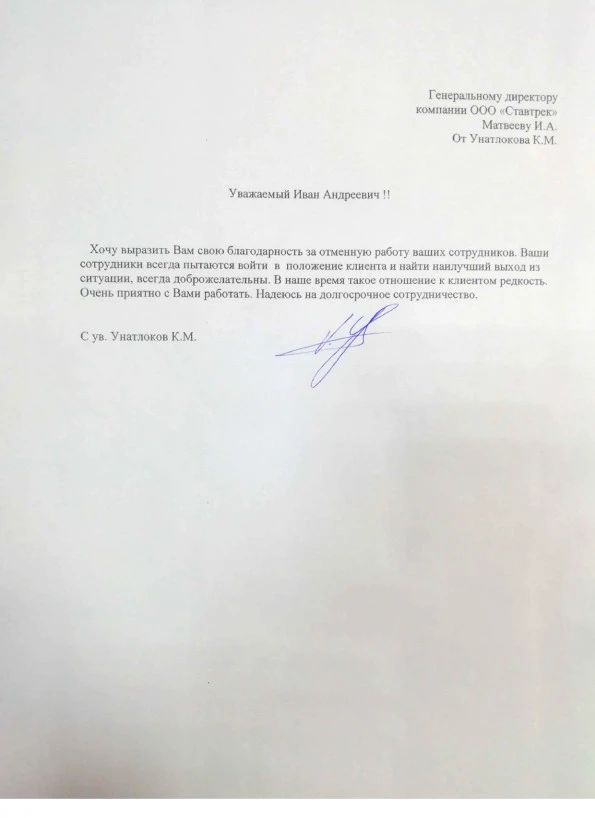 Хотим искренне поблагодарить команду компании «Ставтрэк» за высокий профессионализм и внимательное отношение к клиенту! Сотрудники всегда готовы понять ситуацию, предложить лучшее решение и порадовать своей доброжелательностью. Сейчас такой качественный подход встречается нечасто. Очень рады нашему сотрудничеству и с удовольствием продолжим его и дальше!