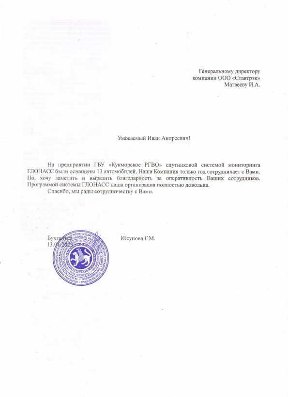 Сотрудничаем с компанией Ставтрэк уже длительное время и полностью довольны результатом. Система ГЛОНАСС/GPS мониторинга транспорта позволяет экономить на топливе и следить за маршрутом каждого автомобиля в режиме реального времени. Также стоит отметить высокий уровень сервиса и оперативность в решении любых вопросов. Благодарны за эффективную и регулярную поддержку.